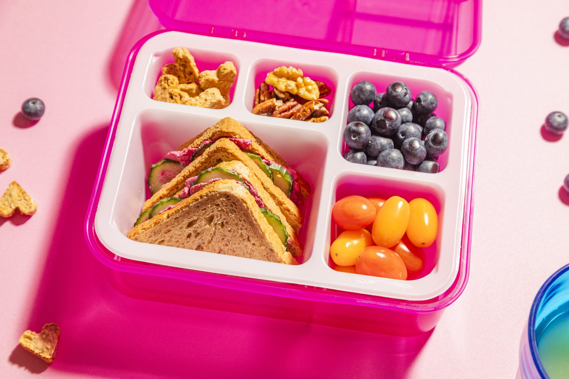 • Beat Pack: kanapka z chleba z ziarnami, różowego twarożku z szynką i ogórkiem, z dodatkiem owsianych serduszek, borówek, pomidorków cherry i mixu orzechów.